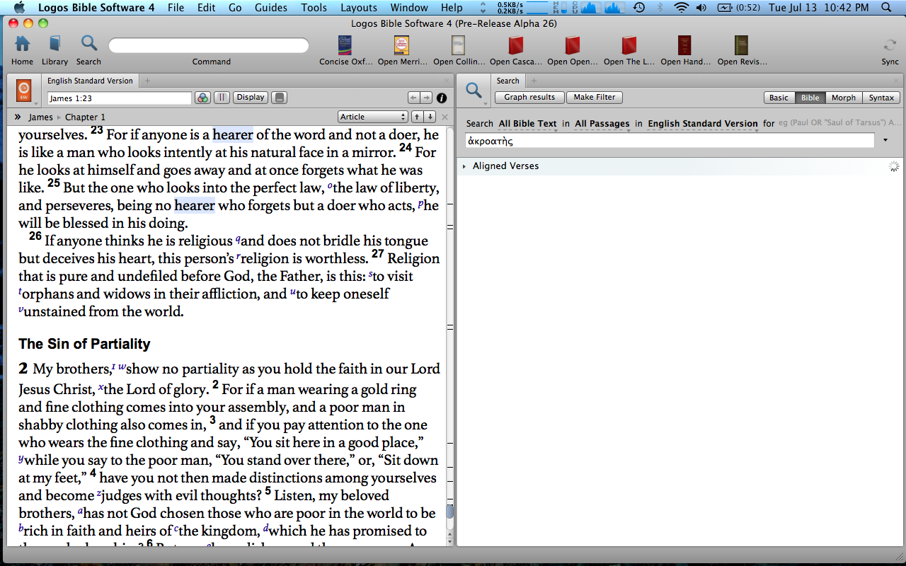 I am searching the lemma for hearer in James 1.23 and the results window is constantly trying to populate.