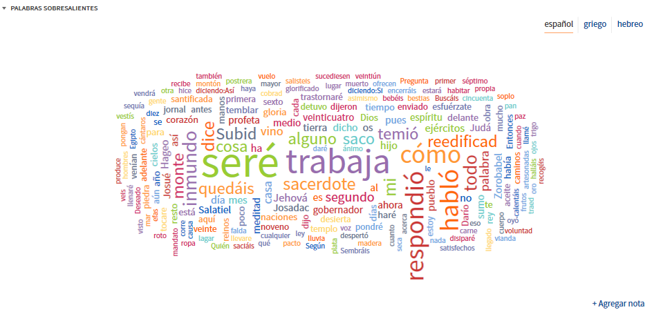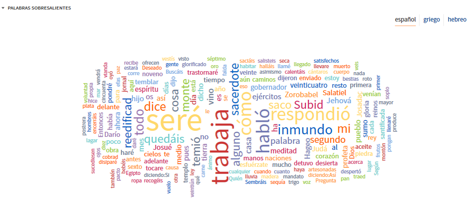 Esta sección toma las palabras del pasaje clave de la guía y compara su frecuencia con las de las mismas palabras en las secciones adyacentes. Los resultados se calculan en tiempo de ejecución y no se extraen de una lista seleccionada. Como tal, los resultados pueden no coincidir con una noción de "importancia" dentro del pasaje. Más bien, esta sección le alerta sobre la frecuencia estadística relativa de ciertas palabras en comparación con el texto circundante, es decir, cuánto "se destacan" de su entorno.