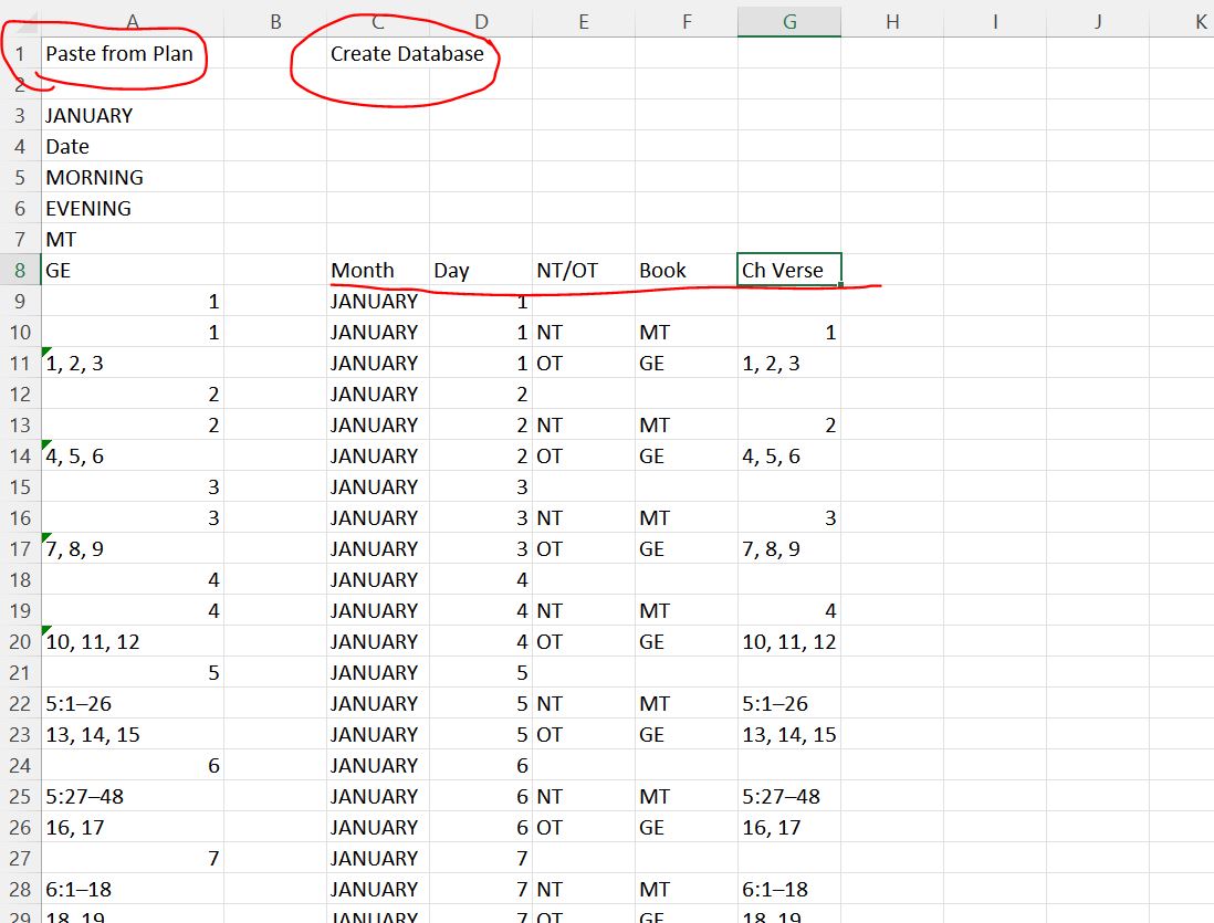 Below is an image from Exel of a practice attempt at converting all the raw data pasted from the study bible into excel, and then formulas that put all this into a database format that can be pivoted as needed by Logos