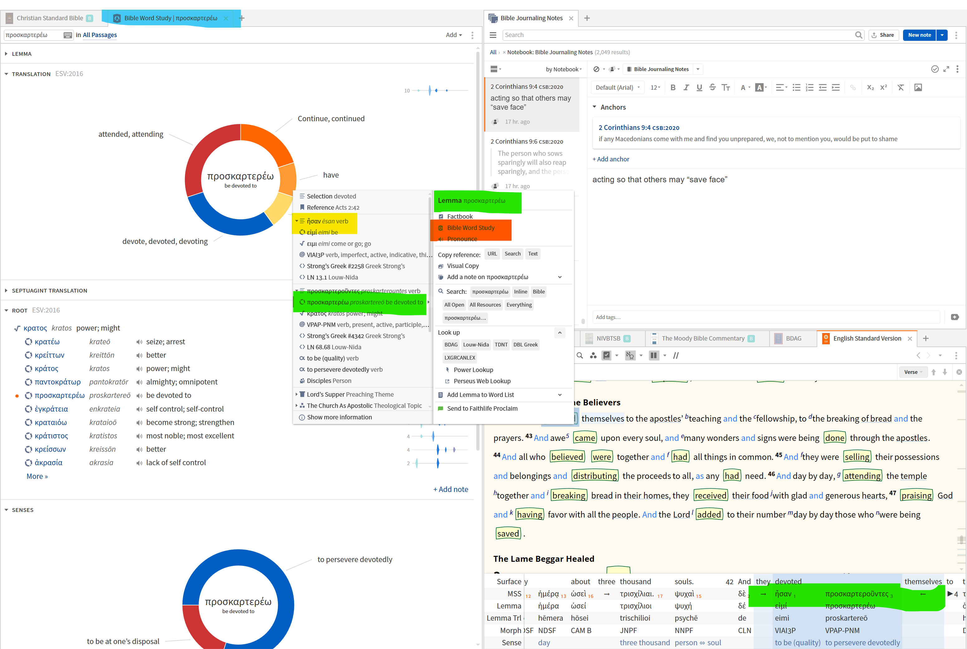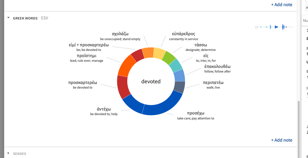 I want to be able to select a word eg Acts 2.42 ESV says they ‘devoted’ themselves I can click on the word ‘devoted’ and get the Greek word ‘proskartereo’ I would like to know the other uses of that greek word ideally with references against them