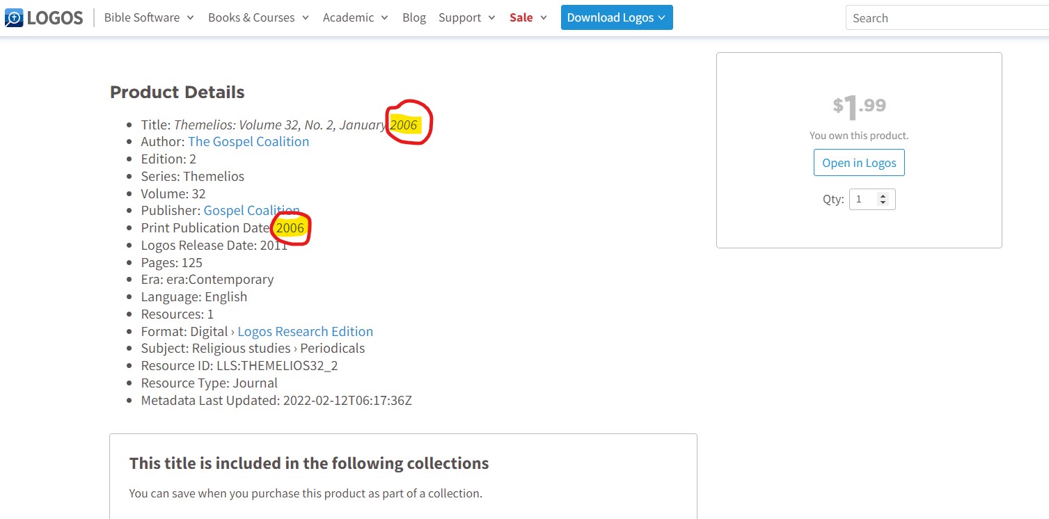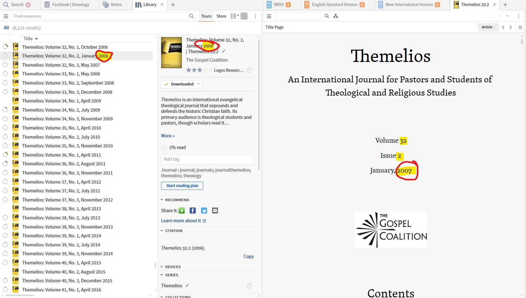 Volume 32, Issue 2 of Themelios is incorrectly titled Themelios: Volume 32, No. 2, January 2006 both in the library and in the Logos store. The issue should be titled Themelios: Volume 32, No. 2, January 2007. As you can see, Issue 2 in January comes after Issue 1 the previous October 2006. Also, the title page of the resource says 2007. See below: