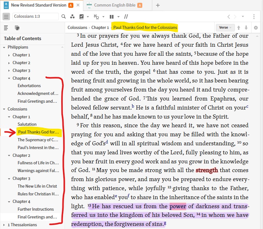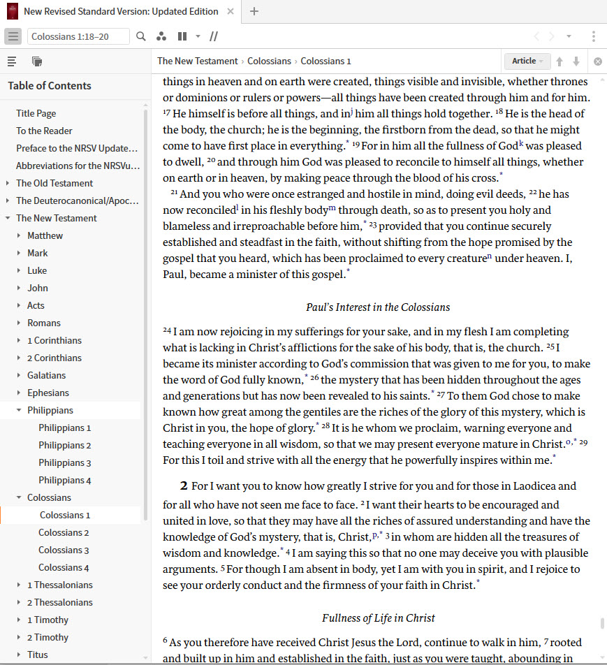 Can someone kindly post a screenshot of their NRSVue with the sidebar showing the Table of Contents and the Navigation Bar showing like my screenshot below? Does the NRSVue have sub-heading level navigation like the original NRSV? That's one of the unique features of the Logos version of the NRSV that I love and hope has been replicated in the NRSVue since other bibles don't seem to have it.
