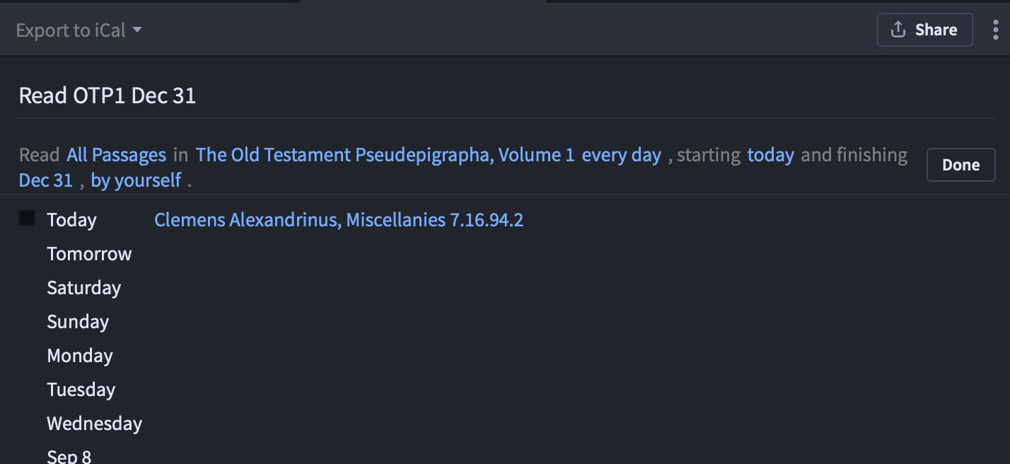 I then tried to simply let logos make the reading plan for the whole volume and was instead given only four distinct readings from random appendixes. Having used a similar approach to read V1, I went back and tried again to see if I was missing anything. To my surprise, trying to autogenerate V1 - which worked before, and is exactly how I read the volume - I was again given four distinct readings from random appendixes.