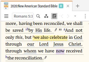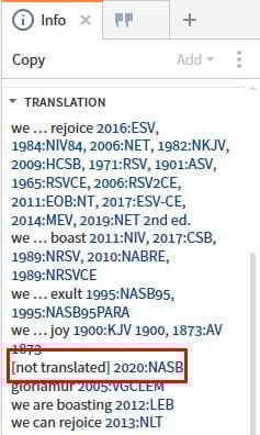 I'm reading the NASB 2020 alongside my Greek NT through this year and came across an interesting translation of καυχώμενοι in Romans 5:11. Normally the word is translated "boast" or "rejoice" but the translators chose to use the word "celebrate". This is fine with me, but, in the info section for this verse it says that this word is "not translated" (see screenshot below). This seems like a tagging mistake to me. What do you think?