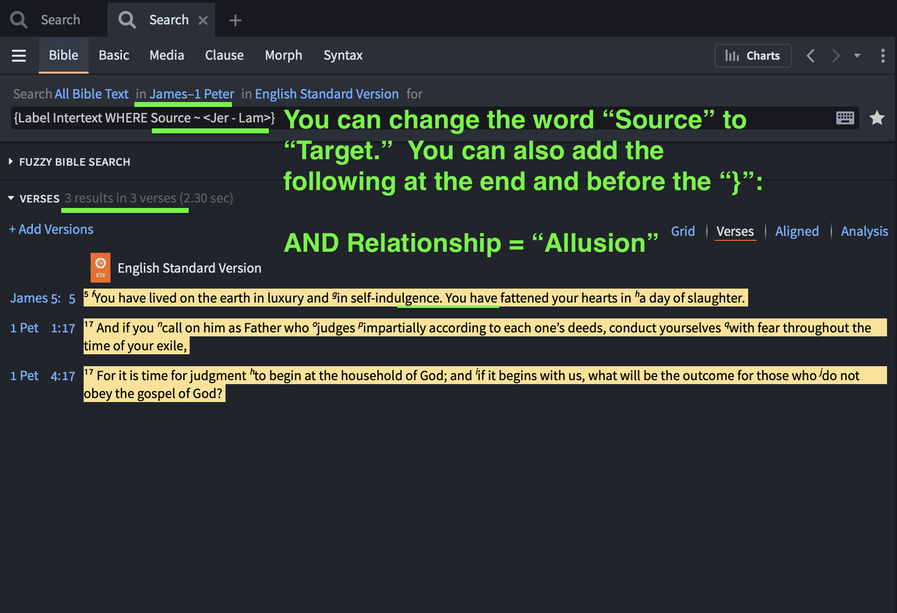 Same goes for source. Suppose I want to look up all the use of the Lamentations and Jeremiah in 1 Peter and James. Is there a way to view them all together?