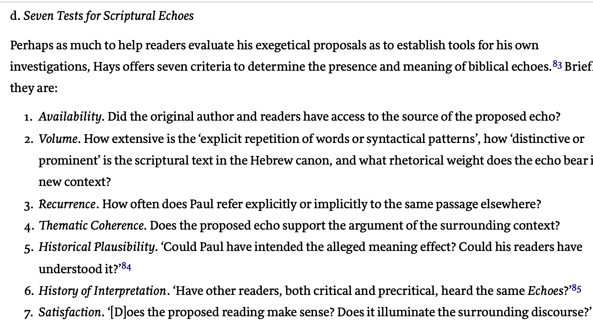 It analyzes 3 authors discussion on the 'how': Michael Fishbane, Richard Hayes (in Logos; an example 'echos' list below), and Michael Boyarin. Much of the discussion is within the Old Testament > 2nd Temple, as to who's using what.