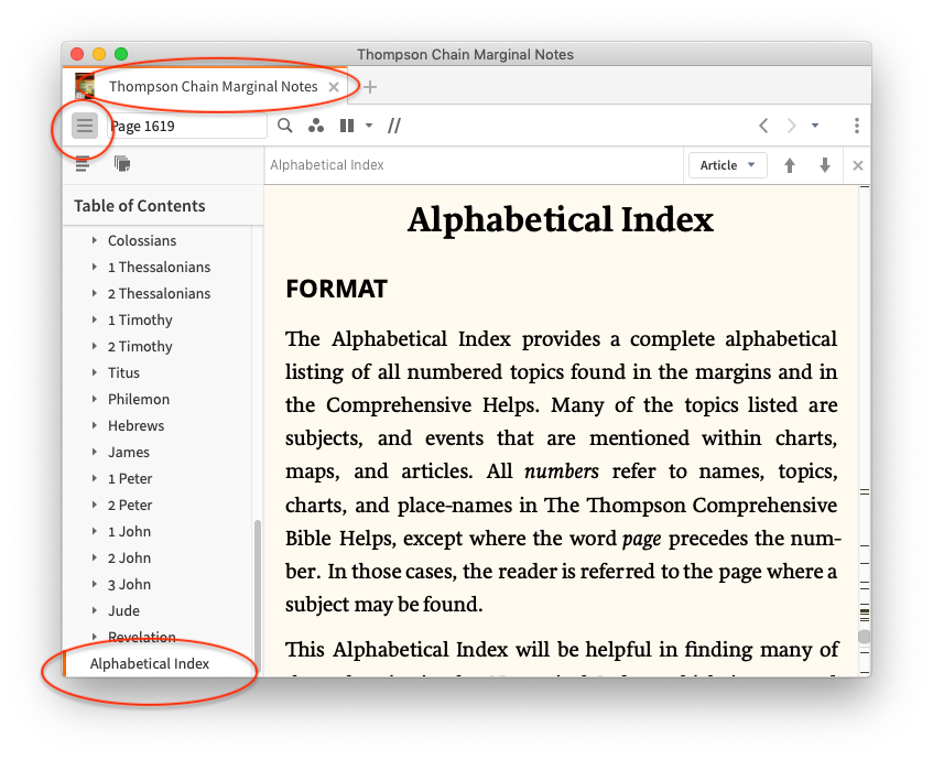 How do I find the Thompson Chain Reference Bible Alphabetical Index.