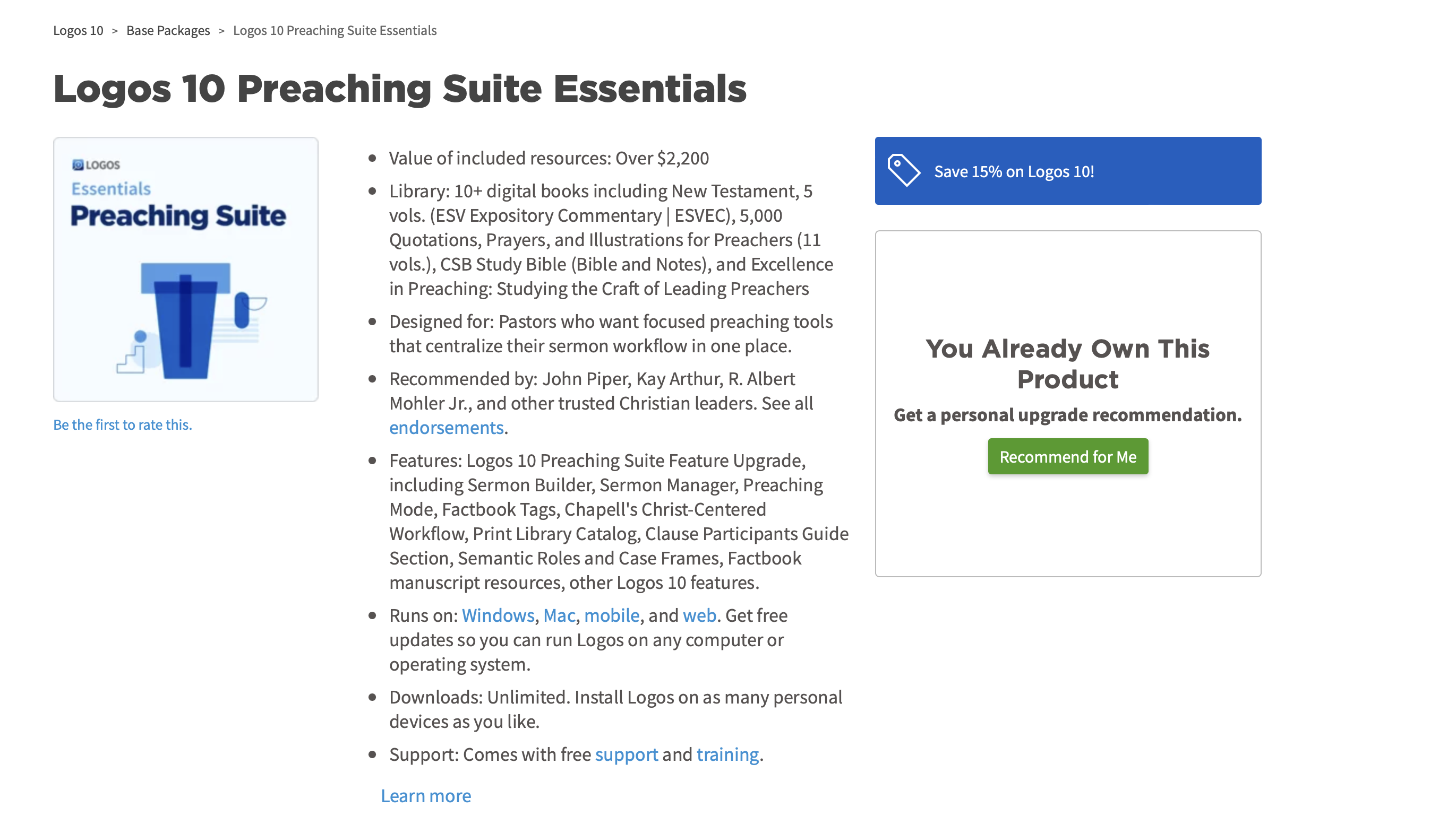 Features: Logos 10 Preaching Suite Feature Upgrade, including Sermon Builder, Sermon Manager, Preaching Mode, Factbook Tags, Chapell's Christ-Centered Workflow, Print Library Catalog, Clause Participants Guide Section, Semantic Roles and Case Frames, Factbook manuscript resources, other Logos 10 features.