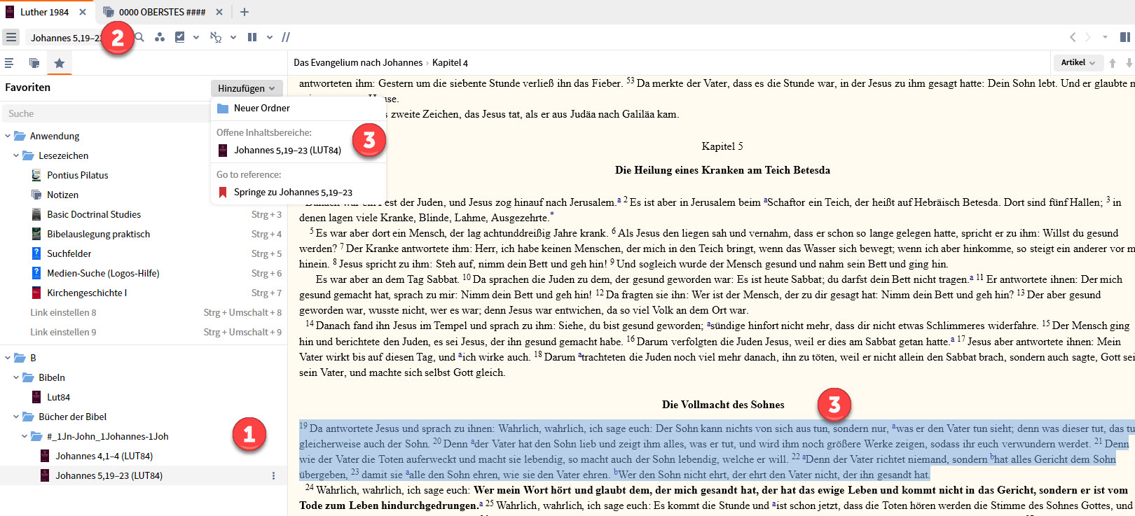 Wenn ich nun in meiner Lut84 mir die Verse Johannes 5,19-23 markiere [2], mir in der Lut84 meine Favoriten anzeigen lasse und Hinzufügen wähle, so erhalte ich die Option [3]: Offene Inhaltsbereiche...
