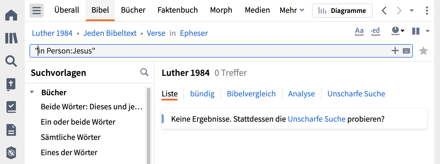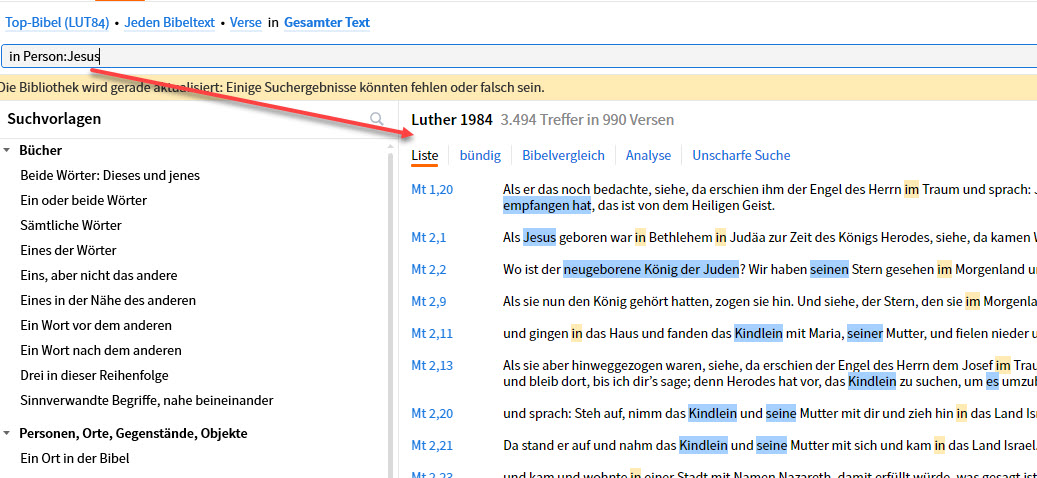 "in <Person Jesus>", dan bekomme och 0 Ergebnisse. Auch andere Parameter, die ich direkt aus dem Video abtippe bringen bei mir 0 Ergebnisse. Wenn ich mit den Vorlagen arbeite, geht es, aber sobald ich in den Vorlagen was ändere, bekomme ich 0 Ergebnisse.