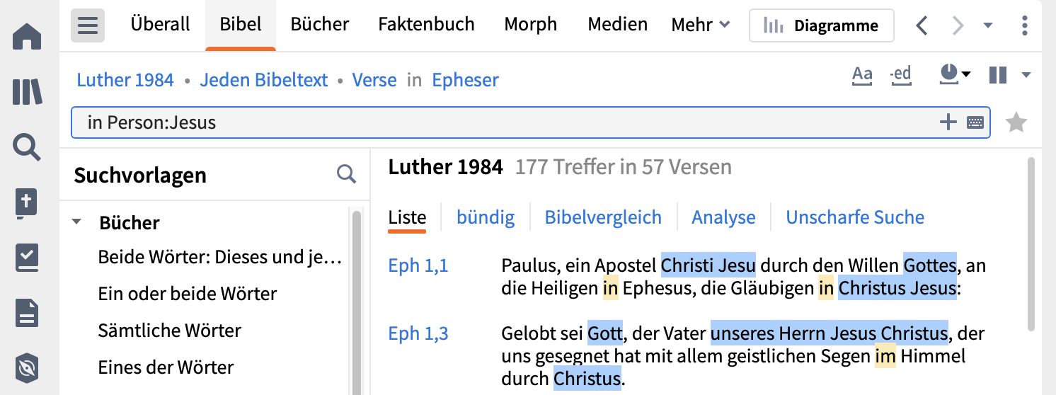 Wenn ich jetzt z.B. nach Stellen suche zum Thema "in Jesus" und die folgenden Parameter eingebe