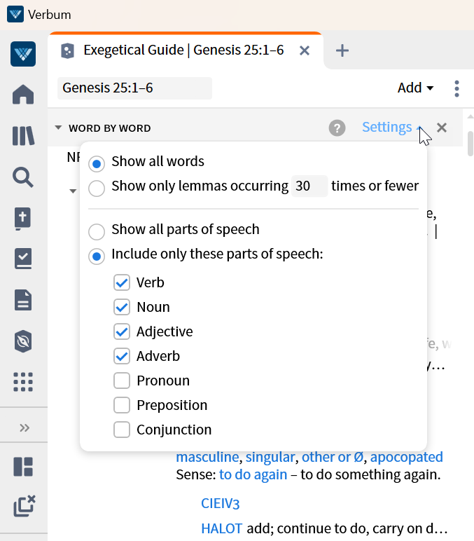 Is there a way to make the word by word part of the exegetical guide include the prefixes as part of the break down... for example in ps 104:8 the first word in Hebrew is יַעֲל֣וּ when you click the drop down bar it removes the יַ from the word and only gives the root of the vowel. same thing with the next word in Hebrew is says the mountains in Hebrew but when you click on it it doesn't show the definite article attached to it as a drop down.. is there a way to add that in to the drop downs so I don't have to look up somewhere else?
