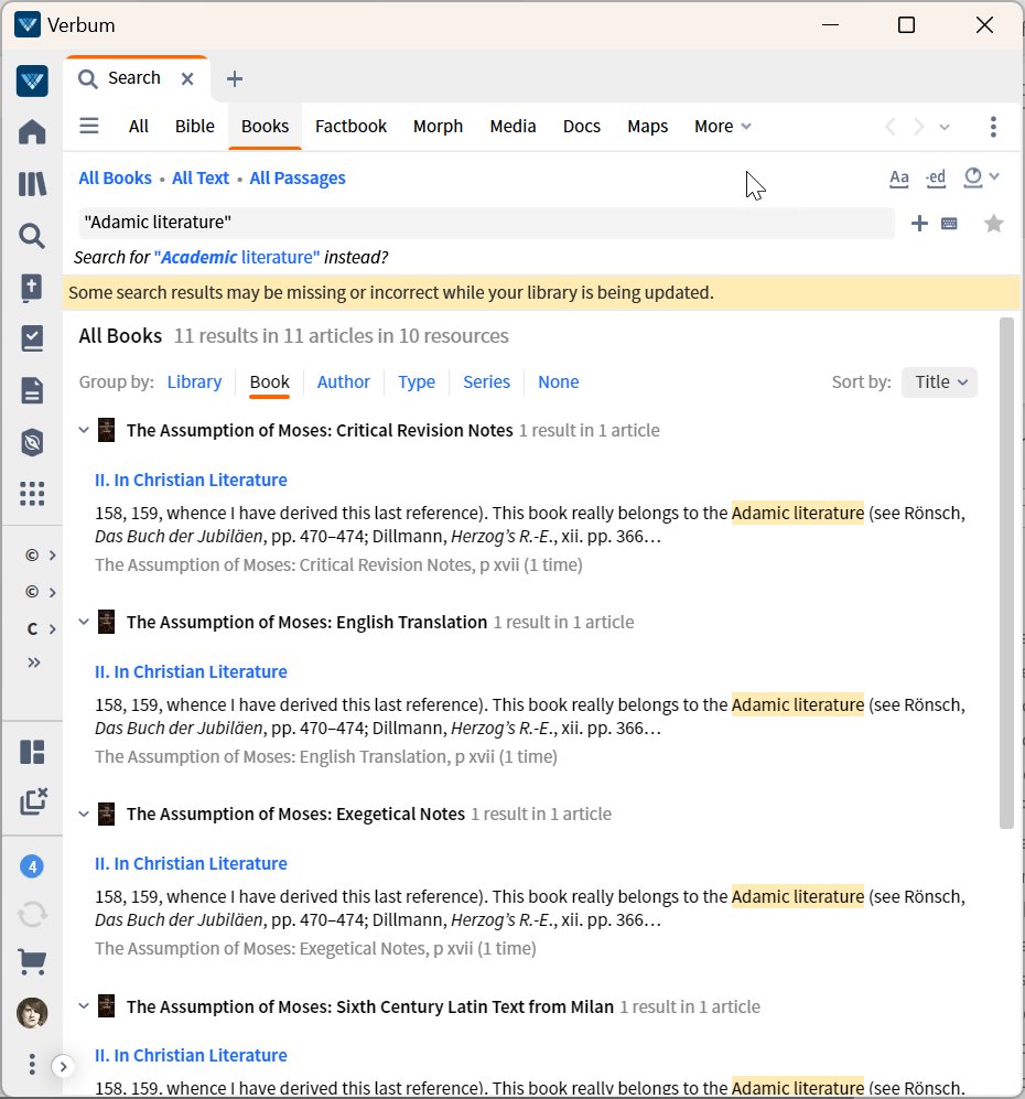 The one book outside Logos becomes many "books" inside Logos without any indication that I know of that they are actually a single resource. In this case, it results in a search result being reported many times - without a clue as to which one(s) reflect the original text. This makes the user workflow process the resource 5 times (4 more than necessary) which is a waste of the user's time.