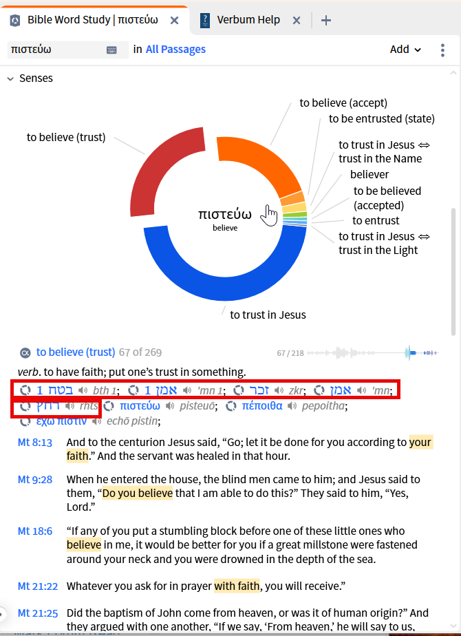 As this is a BWS on πιστεύω I would expect the Senses section to be limited to that lemma. However, if the Senses section is intended to show all words with senses overlapping that of the lemma, then the results are confusing ... at the "concordance" level, Hebrew words are shown in the heading but do not appear in the Bible passage list... all of which leaves me confused as to what the 269 is a count of ...