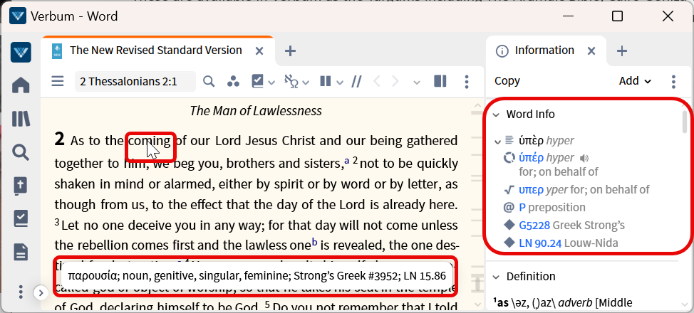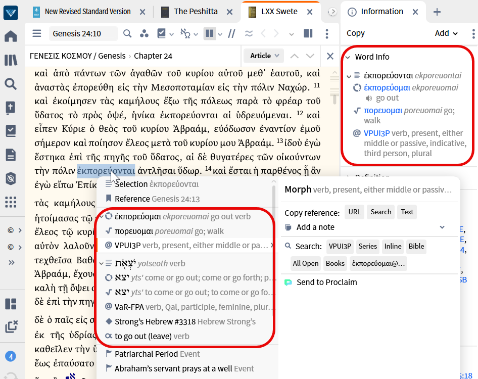 For the Septuagint: The source language is Hebrew, the target language is Greek. The Information panel shows the target language. Note that the context menu shows both.