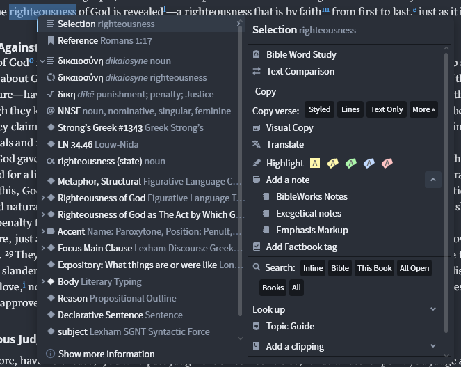 Right clicking on "righteousness" in the original NIV gives: