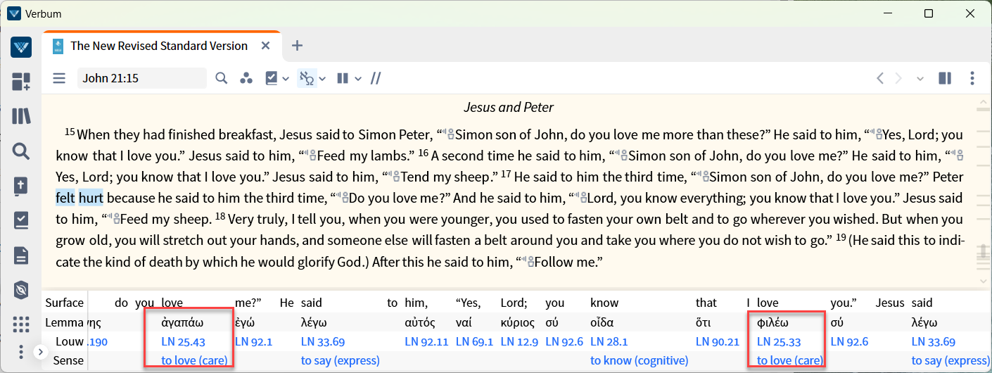 Some exegetes see Christ asking for "Godly" love and Peter only offering "brotherly" fondness. Other exegetes see John using different Lemons to indicate who is saying what in the dialogue.
