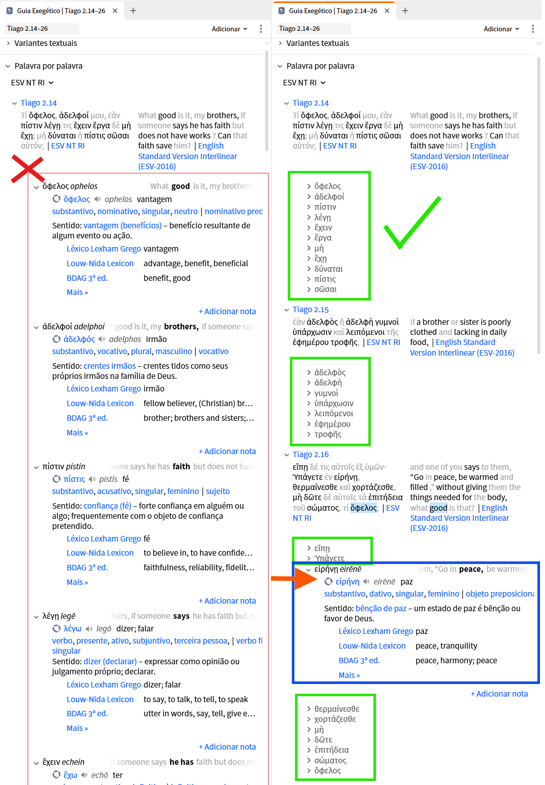 I took a screenshot showing, on the left side, how "word by word" currently appears when opened; and on the right side, how I believe it would be better if each word opened (green rectangle), leaving it up to me to decide which word to expand by clicking on it (blue rectangle and orange arrow).