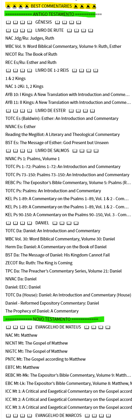 An example where this applies to me is in prioritizing the commentaries on the Gospel of Matthew. The D. A. Carson commentary, “Matthew” (Expositor's Bible Commentary) is in the same volume with Mark and Luke. The website bestcommentaries.com ranks Matthew's (Carson's) in third place, but the other two do not appear in the ranking of Mark and Luke. In this case what will happen is, as I have prioritized the volume in Matthew (portuguese: "Evangelho de Mateus"), when I use a Guide or Workflow searching in Mark and Luke that same book/volume will appear higher in the prioritization because it is prioritized in Matthew which is “higher” in the canon position and in the prioritization functionality.