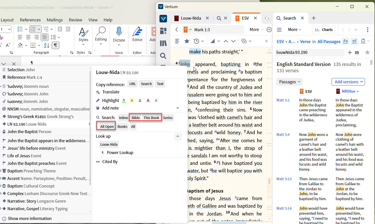 I was playing with the Louw-Nida selection on the tab side and discovered that when my preferred Bible was NRSVue but my open Bible was the ESV, when I selected the Bible search option it built a search that only searched the ESV. I expected it to search either my top Bible or my top 5 Bibles. Rather, two options - Bible and this book - give me exactly the same results. Is this the expected behavior? Please file a bug report and flesh out the documentation so one knows what to expect.