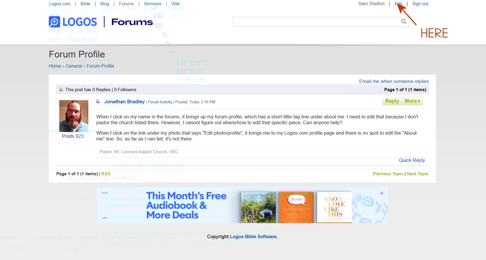 When I click on my name in the forums, it brings up my forum profile, which has a short little tag line under about me. I need to edit that because I don't pastor the church listed there. However, I cannot figure out where/how to edit that specific piece. Can anyone help?