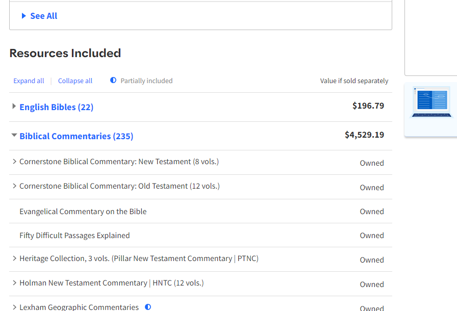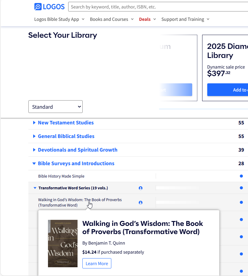 On the new 2025 Library product pages (e.g., 2025 Gold Library) there is no actual list of resources included. I really miss this. Please add this. Try this link (https://www.logos.com/configure/libraries). It should include all resources in each 2025 library with a check box to hide those you already own. If you are not able to see the details, then are you a subscriber? My understanding is that only a subscriber can see details/purchase one of these libraries. Others on the forums have mentioned you can add a subscription to your cart but not complete the transaction as a way past this limitation. Yes, I am a subscriber and I went to that page first. But I agree that it is a mess and hard to read through. And it doesn't give you specific info about a resource like the old libraries do/did. The Logos 10 Library product pages (and Legacy Libraries) each had a list of resources included and a popup with an option to "Learn More" about a particular resource. I don't see why they can't do that with the new libraries as well.