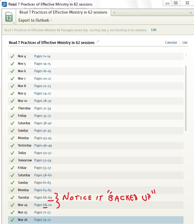 I have a plan: "Read 7 Practices of Effective Ministry in 62 sessions" and every few days after marking "Mark Read", the start bar will begin in the previous days' reading. Also, when I highlighted a sentance with the Large marking, my end bar changed location to several pages later. I haven't noticed such odd behavior in other resources .