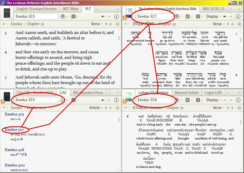 The latter is interesting, since the apparatus is obviously linking to the LXX, not the 'A' linkage. Periodically the HEB interlinear simply looses its verse ID, in which case a down-verse pops back to the start of the chapter. I've concluded that the code's logical linkage is not the same as the displayed linkage. My guess is its connected to computing the font heights incorrectly.