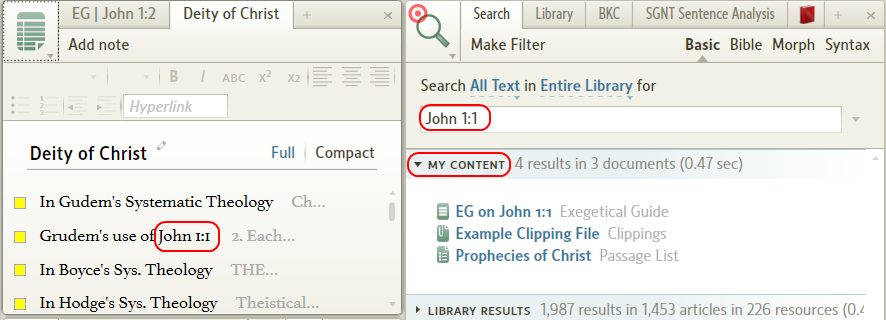 Search will find John 1:1 when it is in the content of a note, but not when it is in the Title (not the title of the Note file) of a specific note it will not find it.