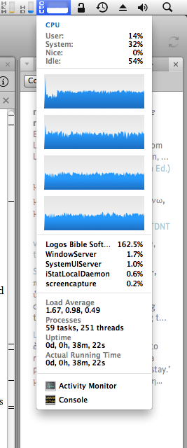 - Result is OS X beach ball, very high CPU usage (see screenshot, no other apps running), Logos non-responsive.