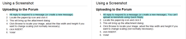 It's technically possible, but the multiple scroll bars make it very confusing, and some people don't find the "Insert" button afterwards. I figured that if you needed instructions to attach the images, you're likely to get confused by the scroll bars, and it was easier to tell people to use the normal reply, than to explain about the scrollbars. But if you disagree, don't hesitate in changing the text.