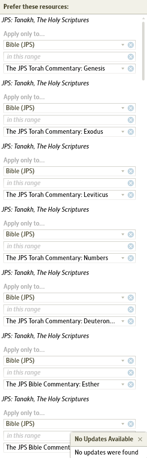 It appears that I cannot specify a commentary series but must specify each book for the Bible I wish to use as its go to reference -JPS commentary to the 2 JPS Tanakhs, D-R to Haydock etc. Is this true? It's a real nuisance now and will be hard to remember to do as resources get added.