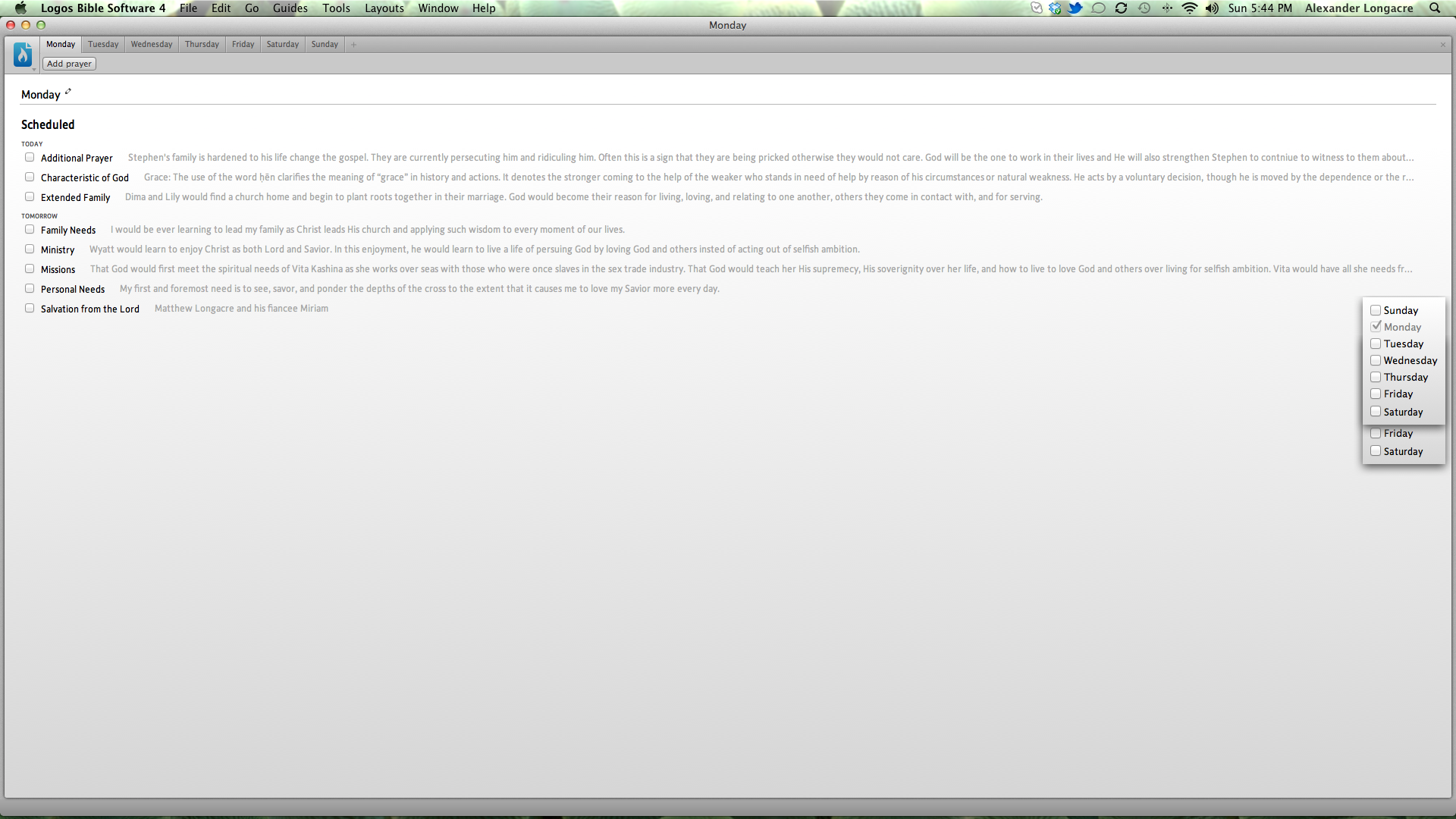 When changing a prayer lists default settings to be setup to pray weekly on any day of the week, the window or the whole program will often crash (behavior depends on if I have the window in the same desktop as the main program [=crash] or on another desktop [=window closes]). Reopening the window ends up with the graphics glitch above (floating panels that cannot be closed).