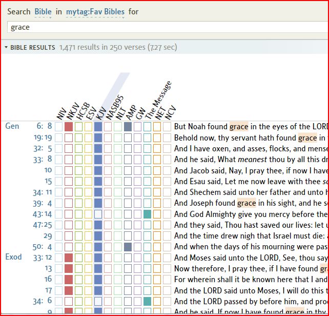 Grid shown below (i have highlighted KJV). I noticed that KJV uses Grace where the others did not in some passages.