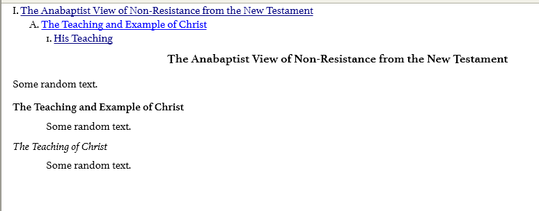 I have an outline at the beginning of a PB. I've whittled it down to just the minimum where I could still reproduce the problem to show you. Each of the three headings in this outline is linked in the Word document to a bookmarked location in the document. In Word, all three of the links work. I can Ctrl+click on them and the cursor jumps to the appropriate heading. But when I compile the PB in Logos, only the first and last ones work; the middle one doesn't work. And it shows up a lighter blue than the other two, which are hyperlink color.