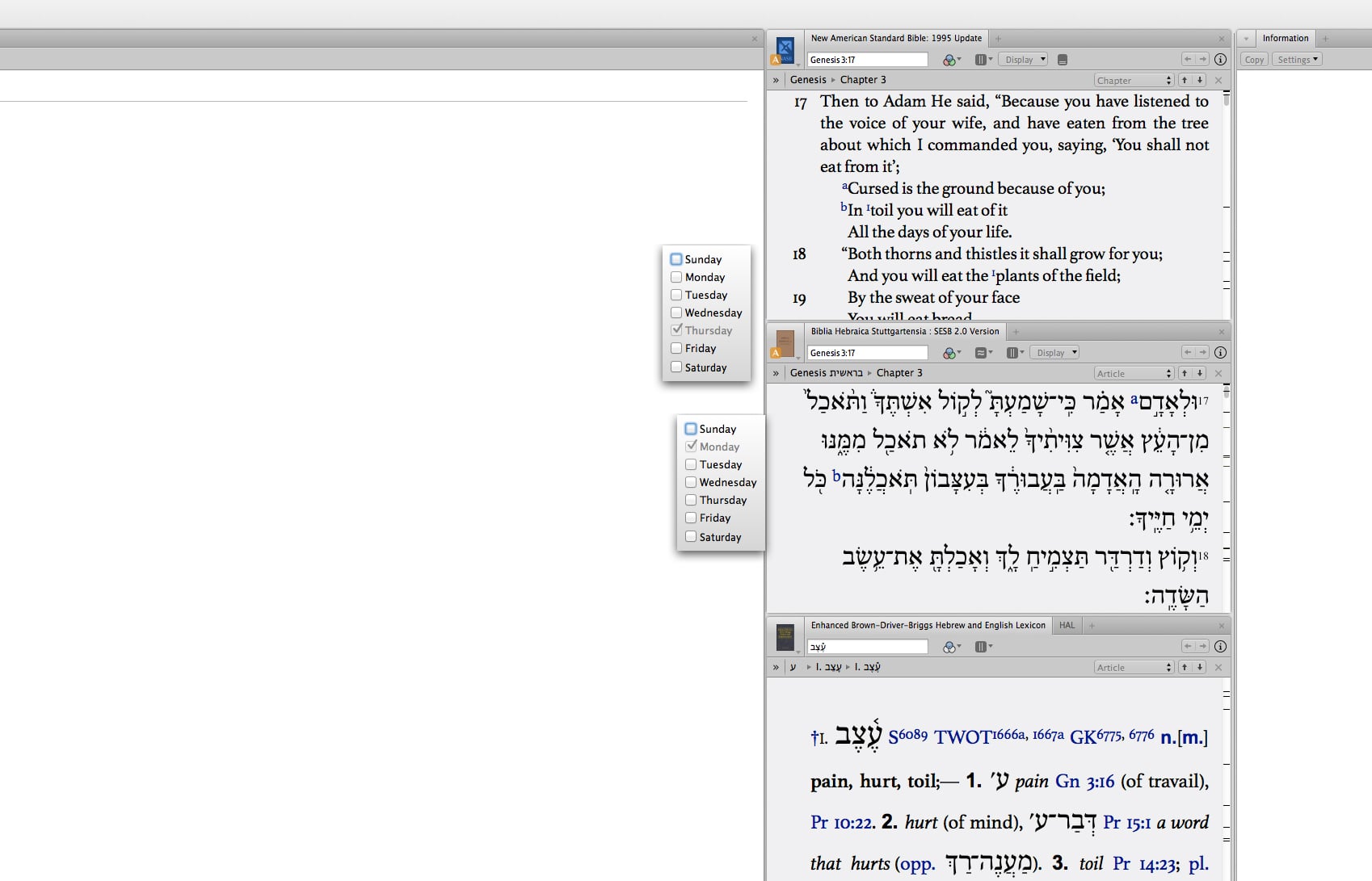I have a repeatable (for me) bug in L4Mac 4.5a (4.51.0.2048) on a 27" iMac. I create a new prayer item, put in the title and details. then when I go to change the date and set to weekly and pick a day, if I click above the new item (white space anywhere) the entire Logos window disappears. The program does not crash, because the floating window on my second monitor stays there, and if I [cmd]+[tab] to a different application and back the window reappears. However at that point I am stuck with a floating popup with the day of the week that cannot be dismissed, acted upon, or in anyway gotten rid of except for closing the program.
