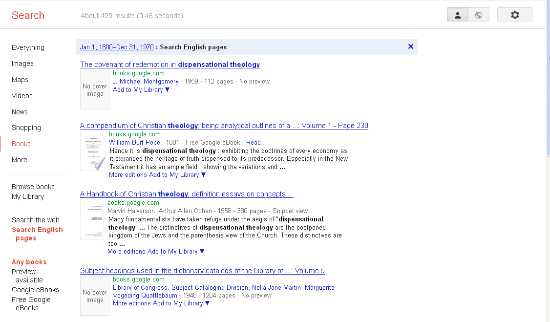 You can see that Covenant theology had a small surge 1870-1910 then in the late 1930's really took off as a major term. Liturgical theology has a blimp in the 1940's (from Dix I suspect) then starts to take off in the 1960's. Dispensational theology as a term is the newest to be used much.