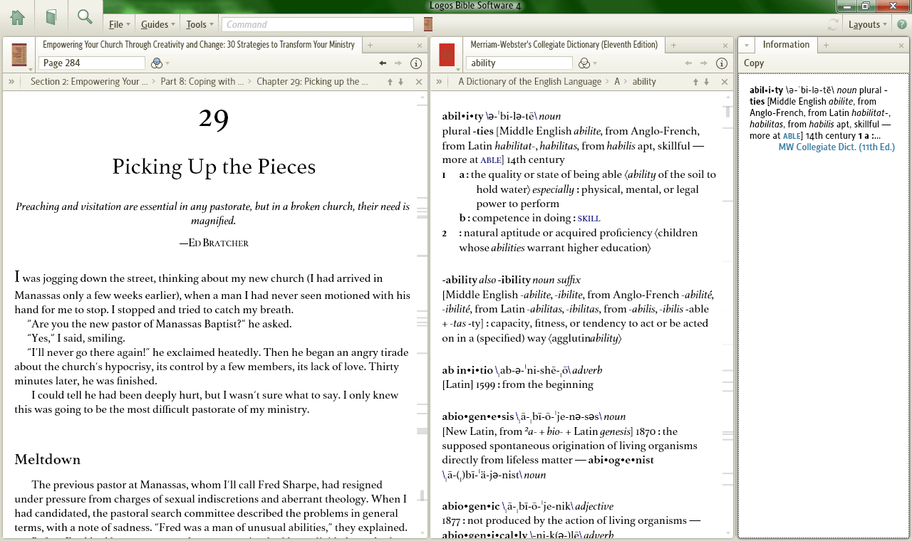 I keep the Information Window up while I am reading so that I can quickly lookup words or verses found in my reading. The information defaults to fulling the right side of the screen which is perfect. Unfortunately it only shows me a portion of the definition of the word I am hovering over.