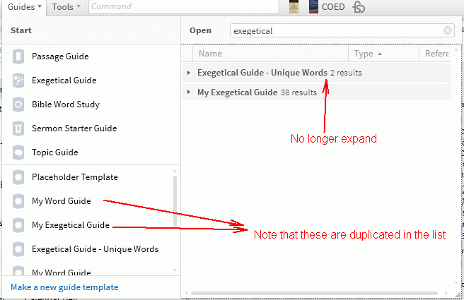 I had deleted all Passage Guide & Exegetical Guide entries (as distinct from My xxxxx Guide) and then noticed that the grouped items no longer expand!