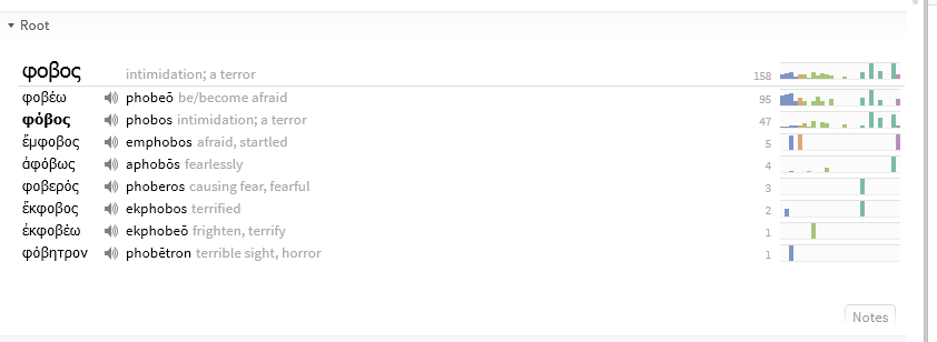 What would be cool-isimo would be if the roots could all be highlighted in the text, or added (copy/paste, via right-click menu) into a search dialog, or (temporary) visual filter.Why? Sometimes there seems to be a play on words going on (e.g. ), that doesn't translate well. Such a filter could expose that. Other times, there is a potential that subtle points are being made by the change from one word to a near synonym. Still other times, ideas and thoughts may be seen as connected through the use of varied terms with a common root.