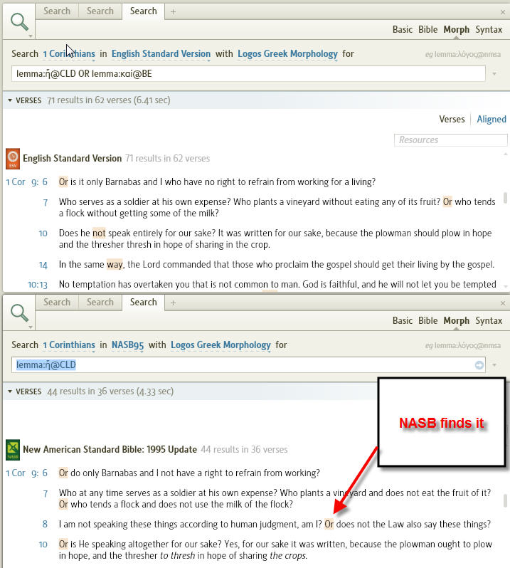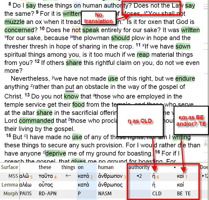 1 Cor 9:8 did not show. An examination of that verse and the use of η there shows that it is parsed as CLD, but not translated because of και following and so is combined as CLD BE TE.