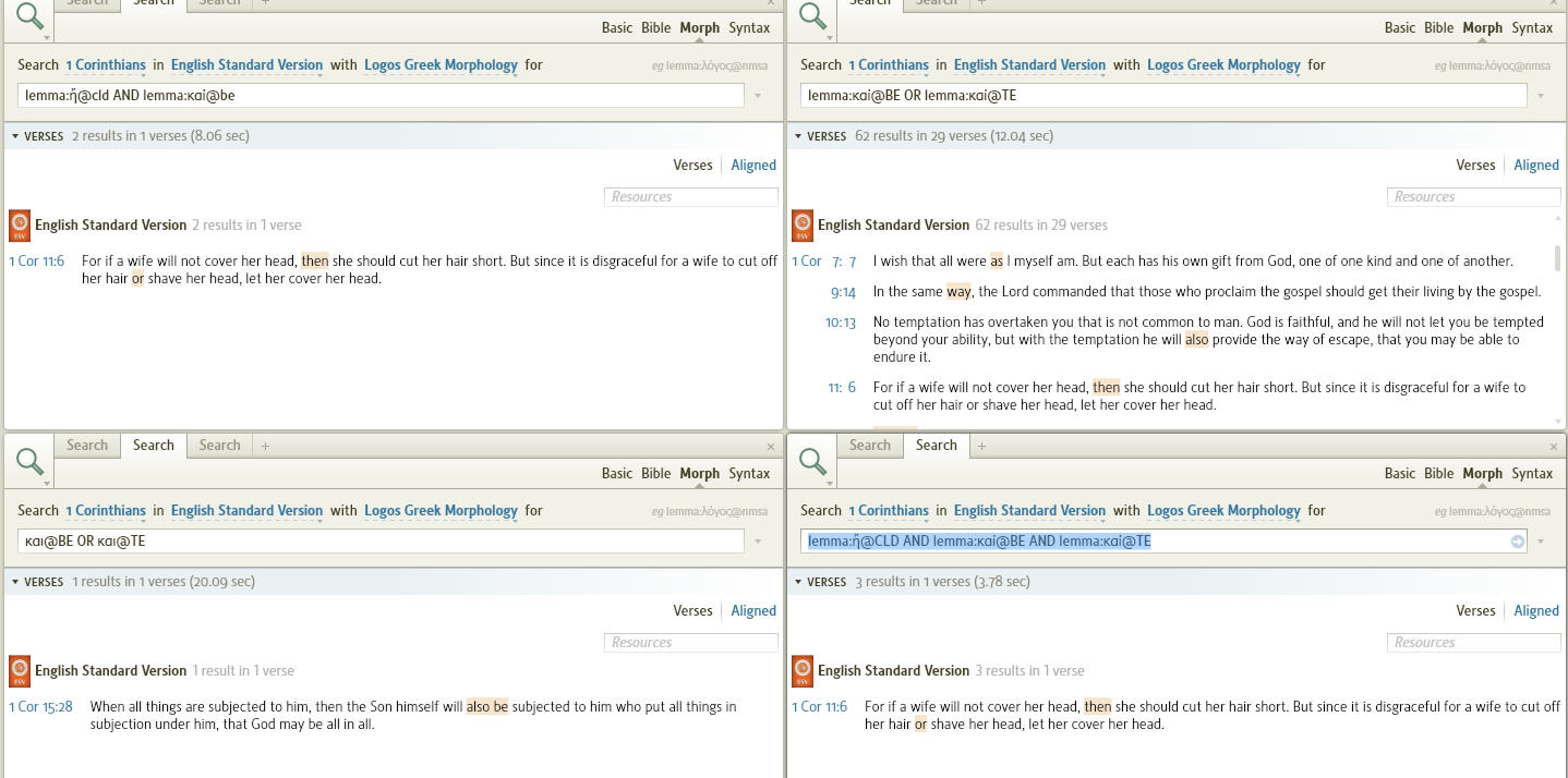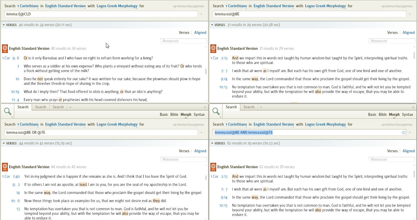 Interestingly enough, if you right click on η in the interlinear in 1 Cor 9:8, it shows as CLD only. And if you right click on και it shows as BE on one line and TE on a second. So, you can search for η as a CLD from 1 Cor 9:8 or και as a BE or as TE, but none show up as one of the results of those searches. I've tried searching for the use of η and και in a number of ways in Morph search and can't get 1 Cor 9:8 to be found.