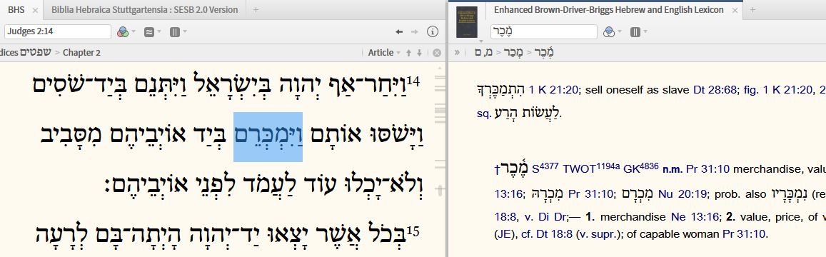 When I double-clicked on the highlighted word on the left, this is how BDB came up. It is not at the top of the entry for the corresponding verb but somewhere in the middle between the verb and a cognate. I have noticed that often and more lately. I don't know if it's linked to BDB in particular since it is my default lexicon (the go to when I double click). Also, I don't know if it is linked to Logos 5 but it might be because I don't remember noticing this before but I sure have in the last little while.