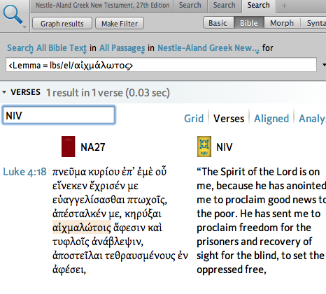 When I right click on a word, and perform a lemma search to reveal all its instances in the selected resource, only the first column shows the searched word highlighted. How can I see the word highlighted in both resources?