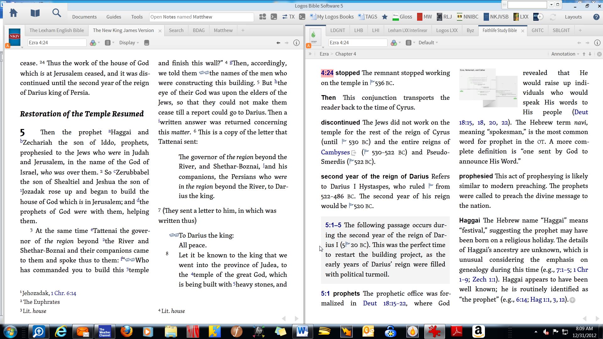 This is probably "old hat" for most of you - but I have found the FaithLife Study Bible very useful in studying a passage of Scripture. It gives a vast amount of background information - which is very quickly accessible in Logos 5 - and also provides relevant TIMELINES (also immediately accessible). I attached a snapshot of how I used it recently in studying the book of Ezra.