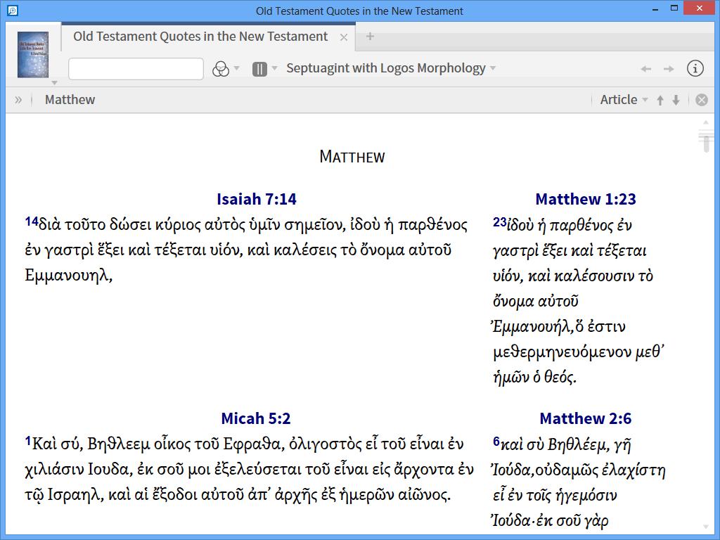 The resource I'm using is Old Testament Quotes in the New Testament, but this works equally well with Old Testament Quotations and Allusions in the New Testament. Like all harmony resources, you can specify which Bible version you want to use. The problem is that Logos doesn't let you specify two different versions.