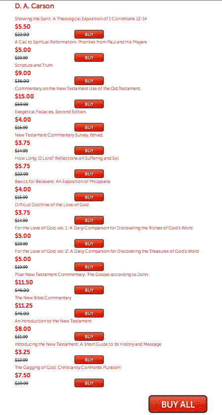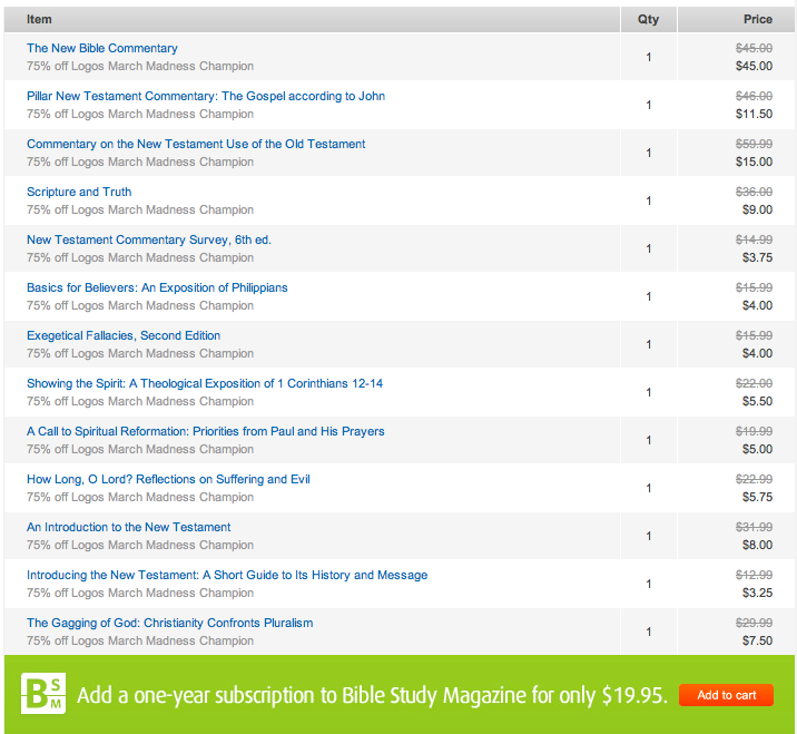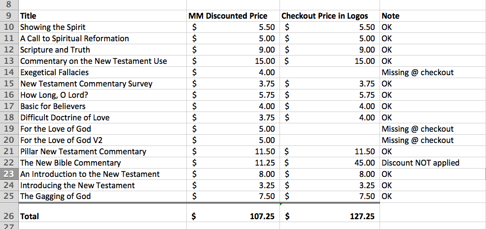 Hi Logos - there's a pricing bug from the MM website and the checkout logos.com page. The items for D. A. Carson on the MM website does not match the items at the Logos checkout when you select "Buy All" call to action. In addition, the pricing for The New Bible Commentary is not applying the discount of 75%. It still shows $45 even when singly selected and coupon applied.