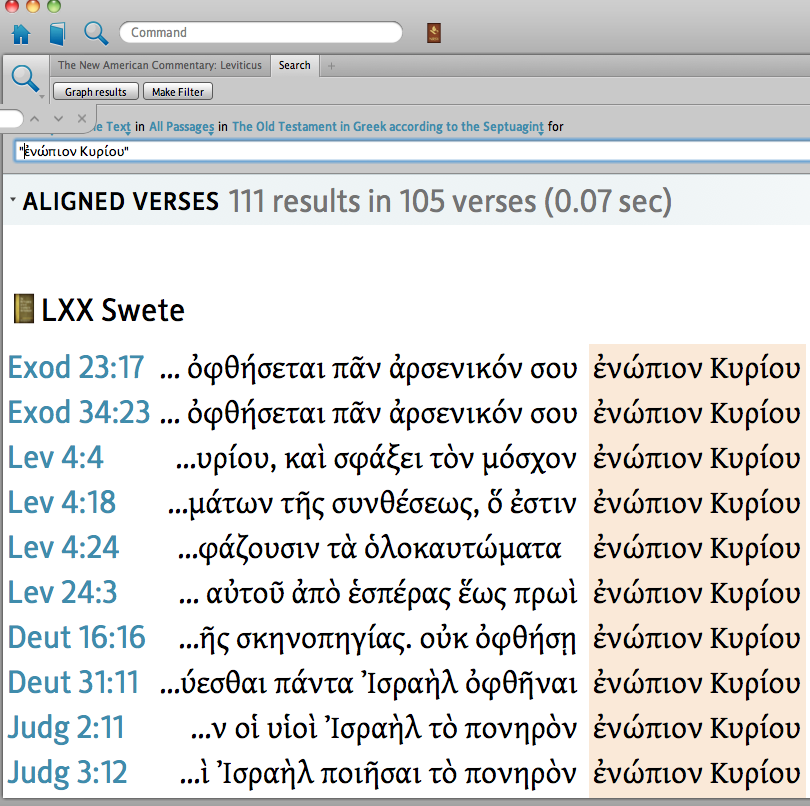 I'm trying to get Logos to list the same verses in Hebrew for the search below. The folks at Logos charge an arm and a leg for this program and then send you off to read manuals and beg for help... Can anyone give some pointers?