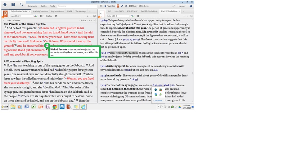 So, I'm doing a study on the fruitless fig farm, and ran my cursor across the "Megaphone" that identifies the speaker (or the person/group addressed), and the vinedresser in Luke 13:8 is lumped in with the Wicked Tenants who rejected the servants sent by their landowner and killed his son. Now, making allowances for the fact that both stories are parables and therefore enjoy a certain degree of latitude with respect to real world events; it seems precipitous to identify this poor fellow with those wicked tenants. See the lovely green highlighted callout in the pic below: