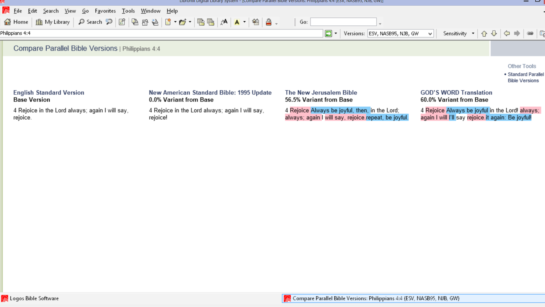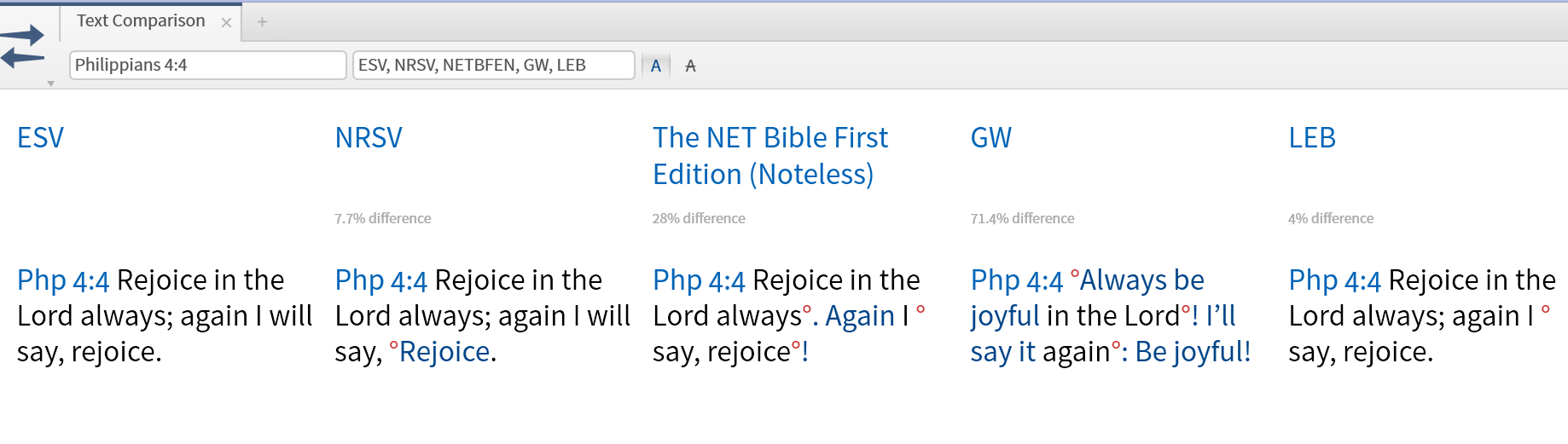I was surprised when I quickly compared versions that the algorithm has changed, for example comparing God's Word to ESV has a different percentage. Am going to have to ponder that...